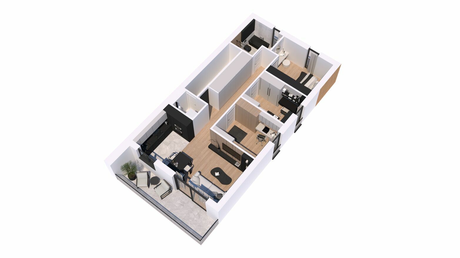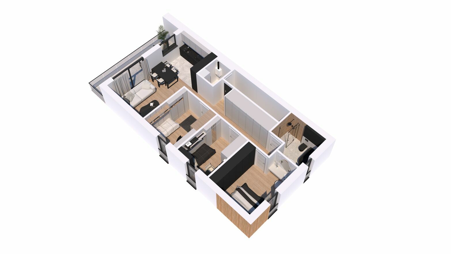 salonu, aneksu kuchennego, 3 oddzielnych sypialni, łazienki, pomieszczenia gospodarczego/pralni, wiatrołapu oraz holu z miejscem na dużą szafę. Istnieje możliwość zmiany/usunięcia ścian działowych.