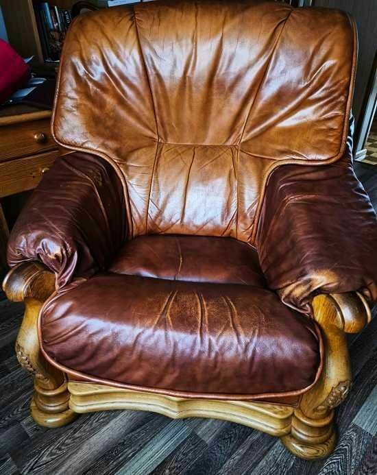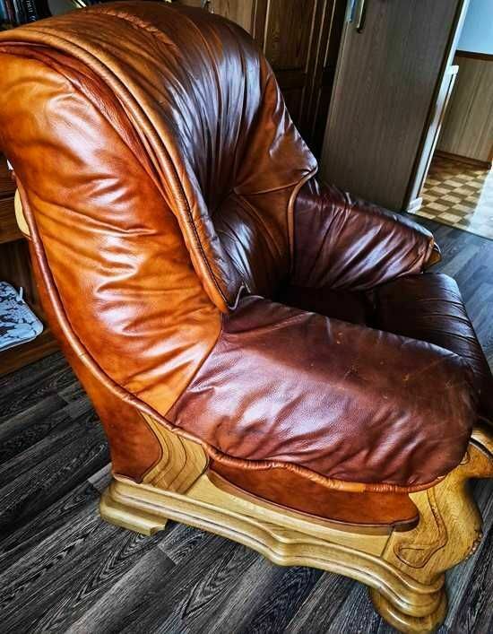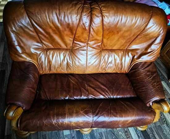 Solidny, skórzany zestaw wypoczynkowy 2+1 w ciepłym, brązowym kolorze. Wykonany z naturalnej skóry i drewna,ciężki masywny, nadający wnętrzu przytulny i stylowy charakter.Stan dobry,ślady użytkowania.Kanapa 2 osobowa ma schowek.Możliwy transport po uzgodnieniu.Odbiór tylko osobisty.Sprawdź zainteresowanie tym ogłoszeniem