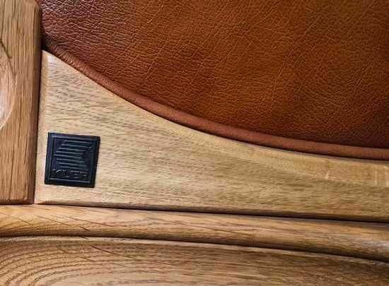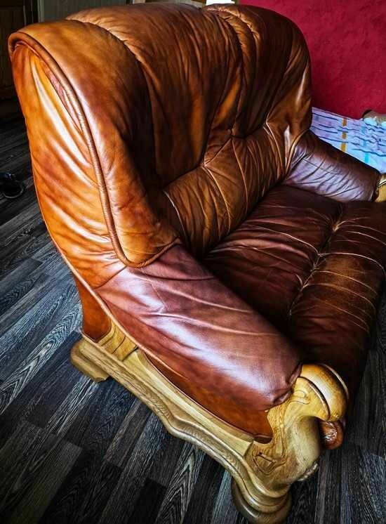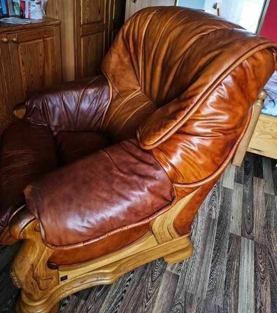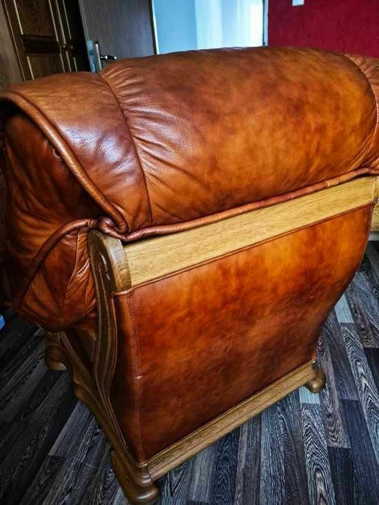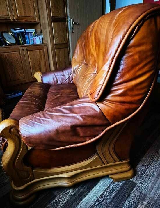Komplet wypoczynkowy 2+1 drewno, skóra prawdziwa